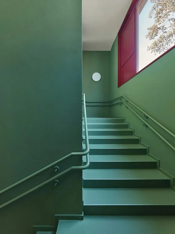 Ein entscheidender Bestandteil dieses Konzepts ist die gezielte Farbgestaltung, die die Nutzung der Räume definiert. Weiße Flächen werden als Mehrnutzungsräume gestaltet, die flexibel und vielseitig einsetzbar sind. Diese neutrale Gestaltung schafft eine ruhige Atmosphäre, die sich an verschiedene Funktionen anpassen kann. Im Gegensatz dazu werden farbige Räume bewusst als Bewegungsflächen eingesetzt. Die bunte Gestaltung lenkt die Orientierung, fördert die Dynamik und unterstützt die intuitive Navigation innerhalb des Gebäudes.
